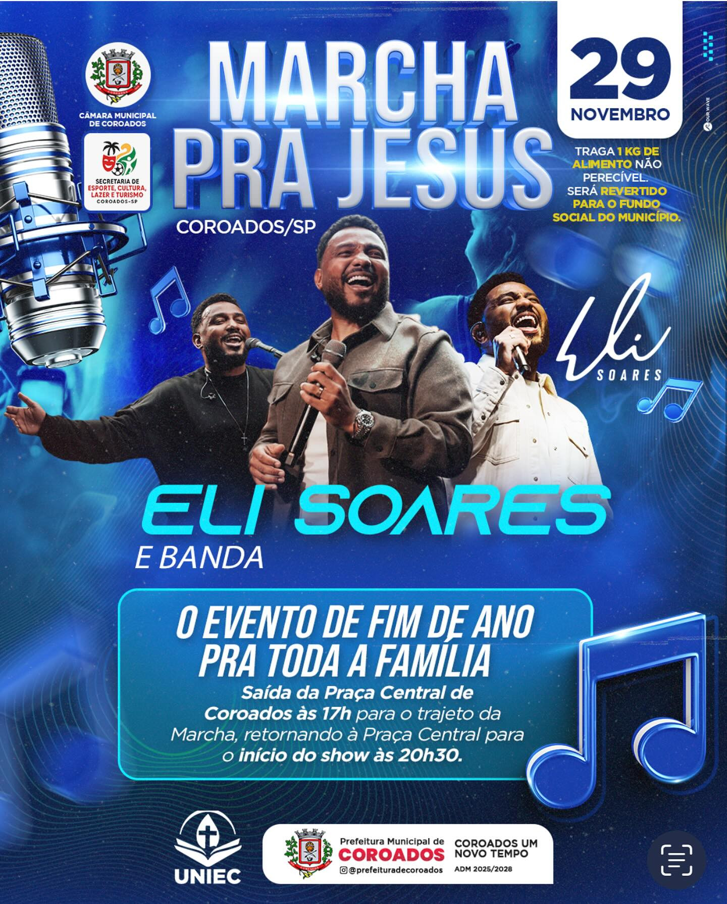 MARCHA PRA JESUS EM COROADOS SP , REALIZAÇÃO : PREFEITURA MUNICIPAL DE COROADOS SP, SECRETARIA DE CULTURA DE ESPORTE LAZER E TURISMO, APOIO : CAMARA MUNICIPAL DE COROADOS ,COPEC CONSELHO DE PASTORES E LIDERES DE COROADOS SP, RADIO VIDA LIVE COROADOS SP ,ORGANIZAÇÃO UNIEC UNIÃO DAS IGREJAS EVANGELICAS DE COROADOS SP.